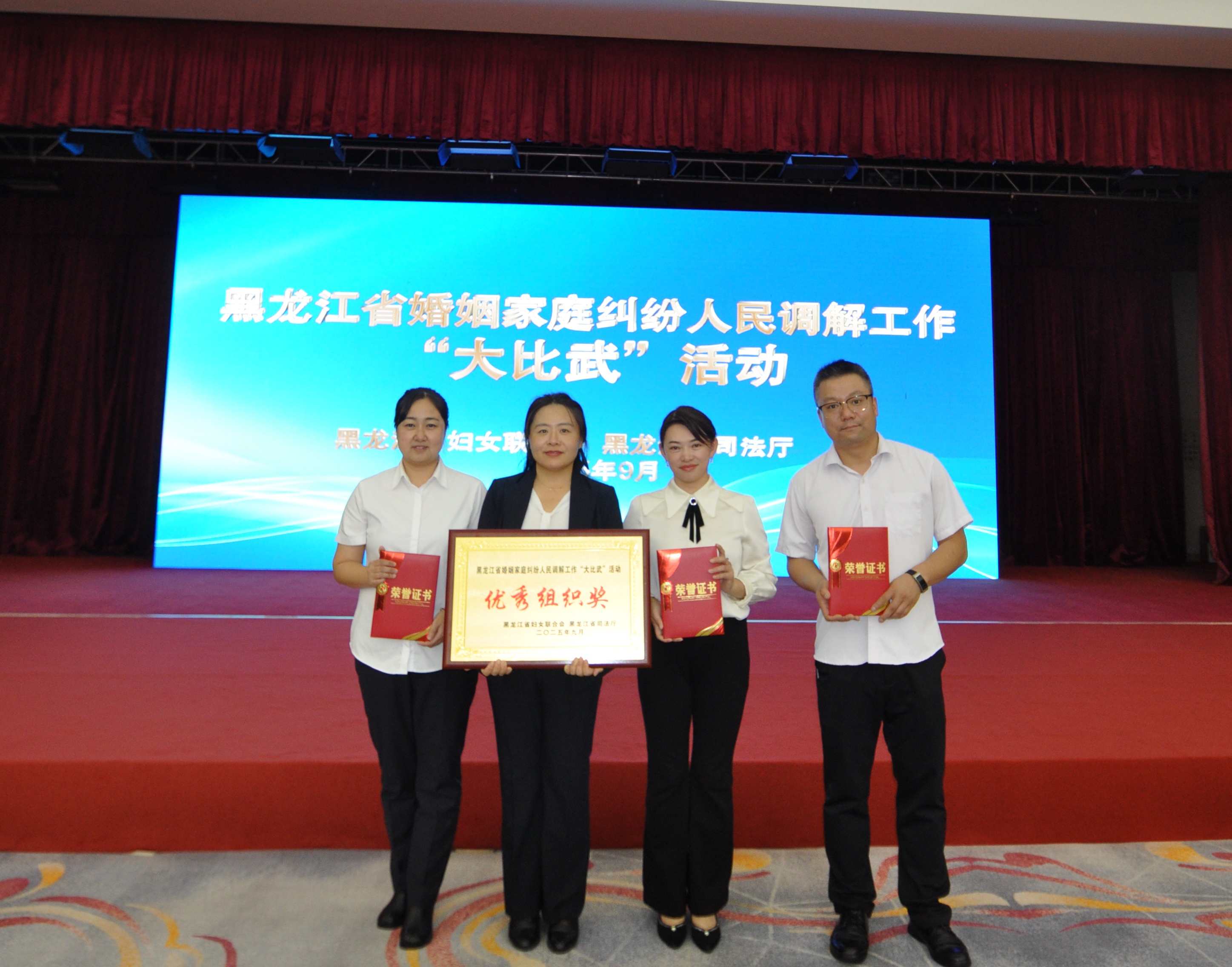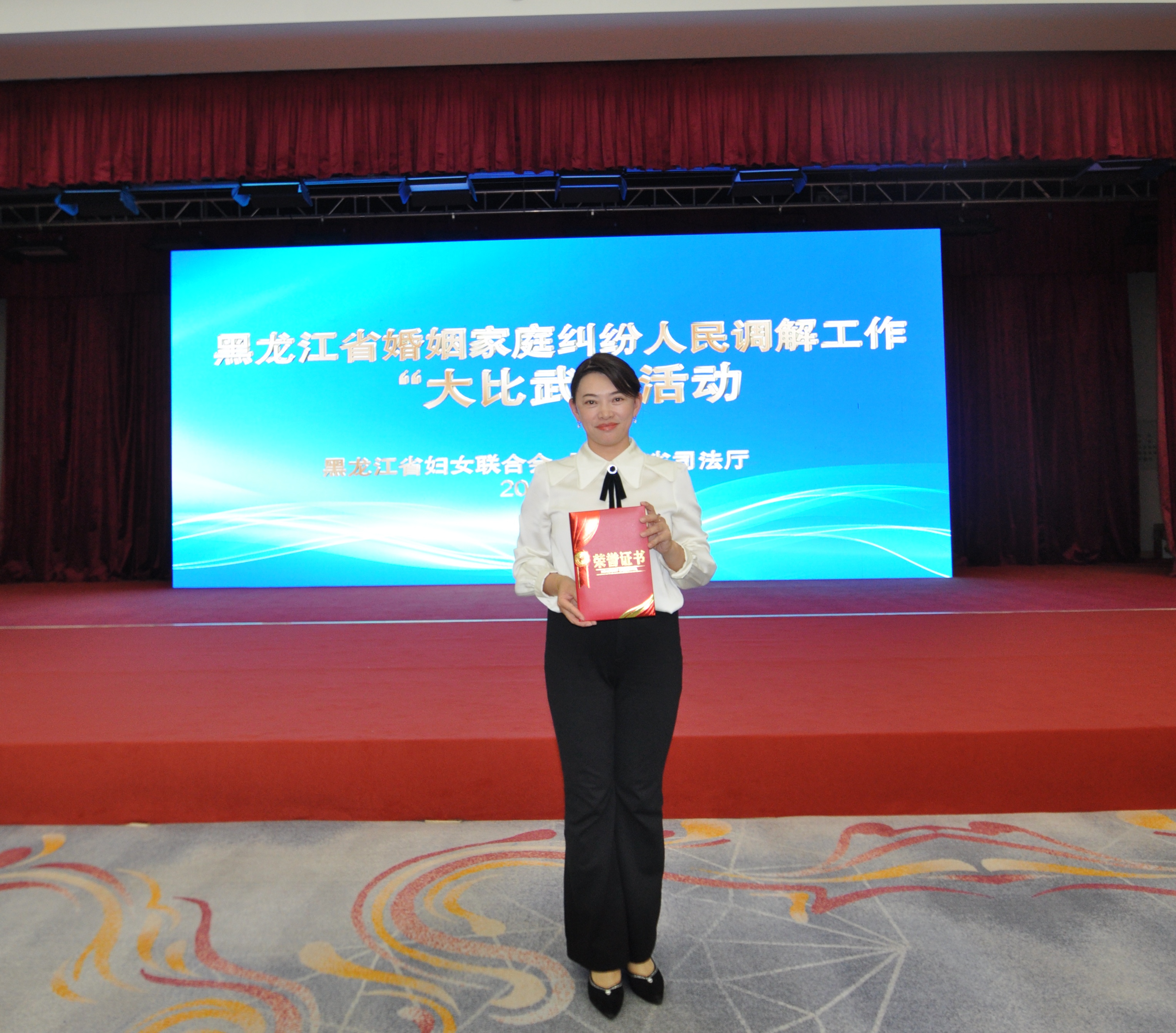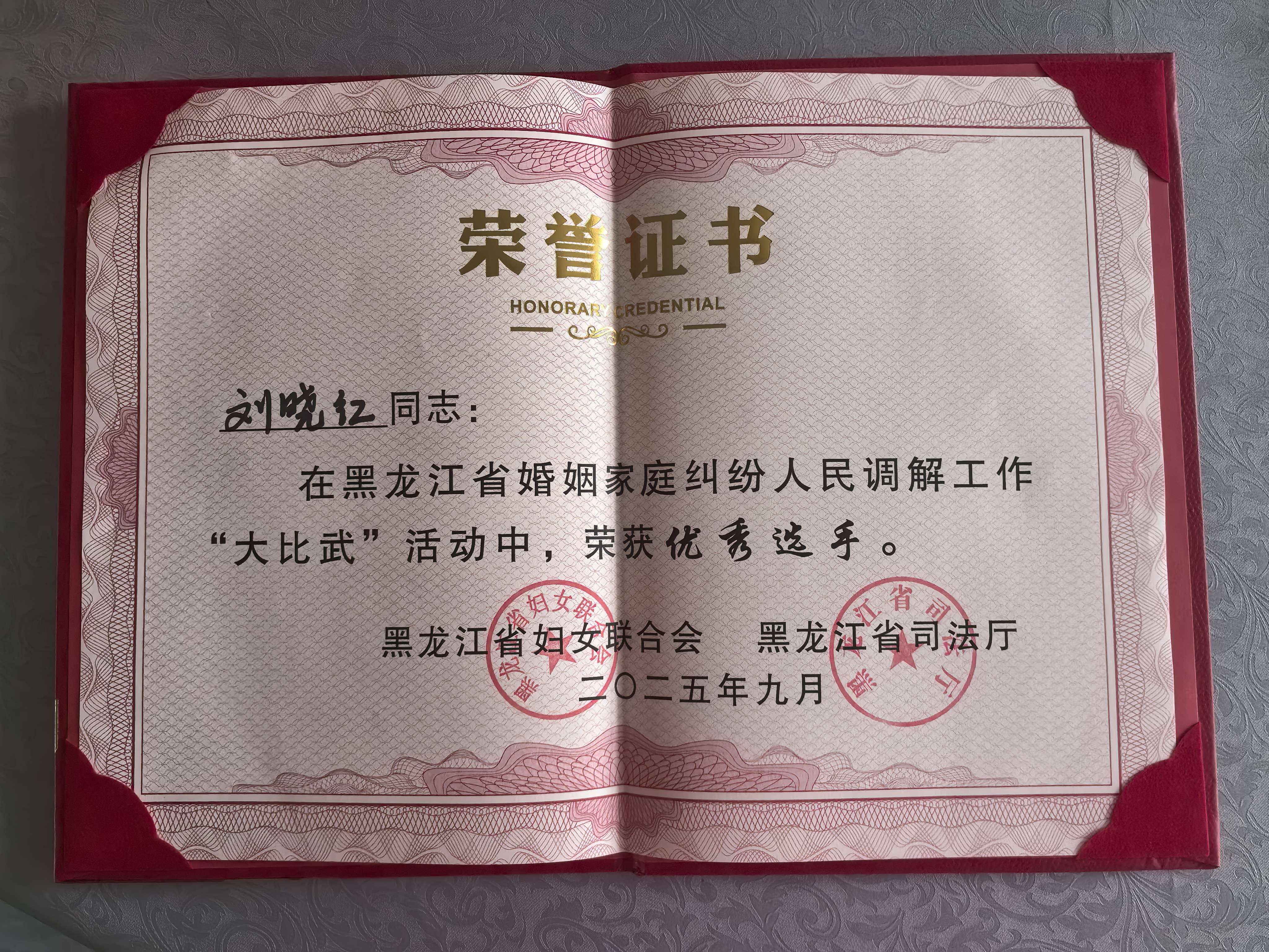 凭借在市级“大比武”中的亮眼表现,刘晓红脱颖而出,作为绥化市代表队的核心成员,参加了黑龙江省妇联与省司法厅联合举办的黑龙江省婚调“大比武”活动。全省婚调“大比武活动”有全省13个市(地)的13支代表队、39名选手参加,比赛设置笔试考察、知识竞答、模拟调解三大环节,构建“理论筑基—应变提速—实战锤炼”的全维度考核体系。大赛最终评选出团体优秀奖及一、二、三等奖。